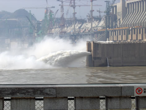 Barrage des Trois Gorges : chutes d'eau à la sortie des turbines en aval du barrage |
